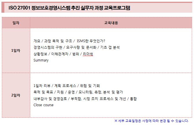 ISO 27001 정보보호경영실무자 및 감사자, 정보보호관리자 및 책임자